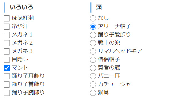 チェックボックスにチェックを入れると着て、チェックをはずすと脱ぎます。また、ラジオボタンで複数から選択する場合もあります。