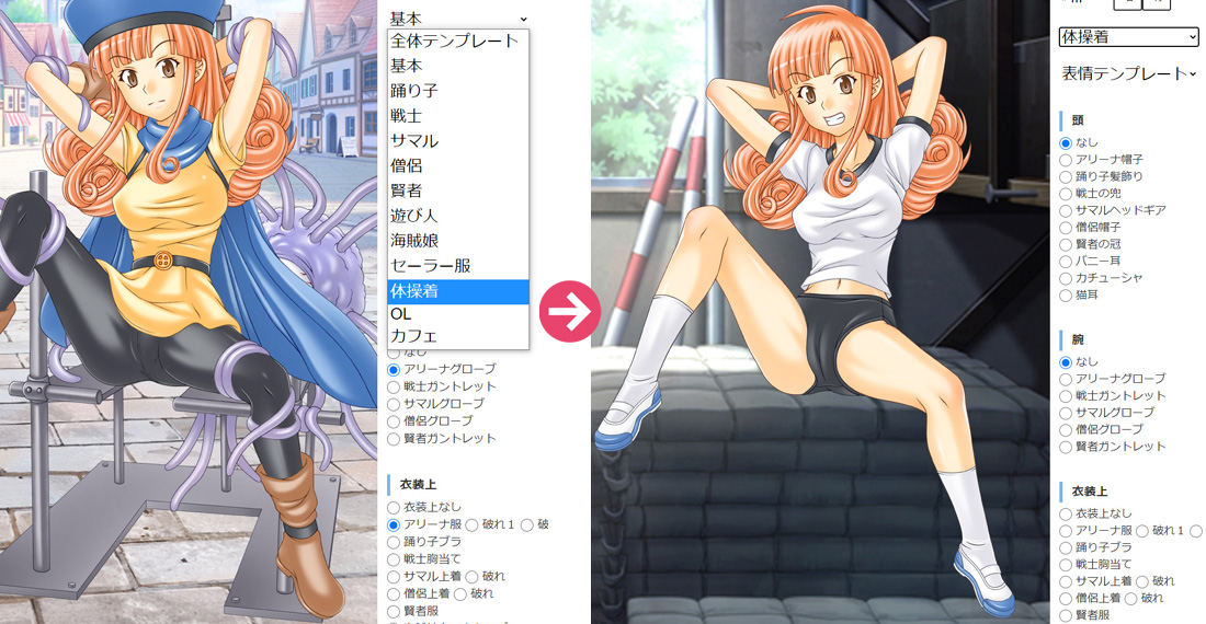 「テンプレート」というドロップダウンリストを使うと、用意されたシチュエーションの衣装に一括で初期化されます。