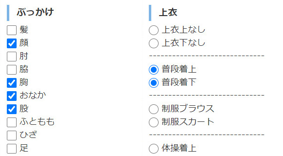 チェックボックスにチェックを入れると着て、チェックをはずすと脱ぎます。また、ラジオボタンで複数から選択する場合もあります。