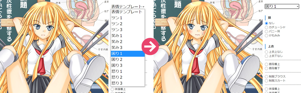 「表情テンプレート」というドロップダウンリストを使うと、表情だけ一括で初期化されます。